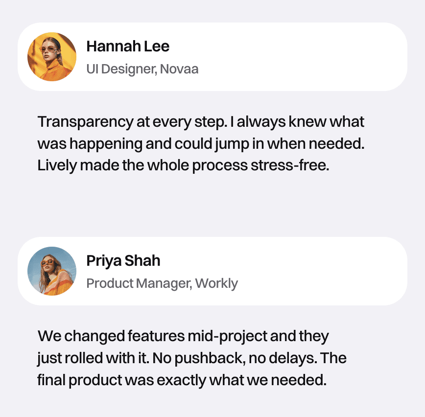 We believe great products don't come from juggling freelancers or managing technical complexity. They come from clear communication and committed partnerships. That's why every Lively engineer takes full ownership of your project—understanding your vision, executing the technical work, and sticking around as you grow.